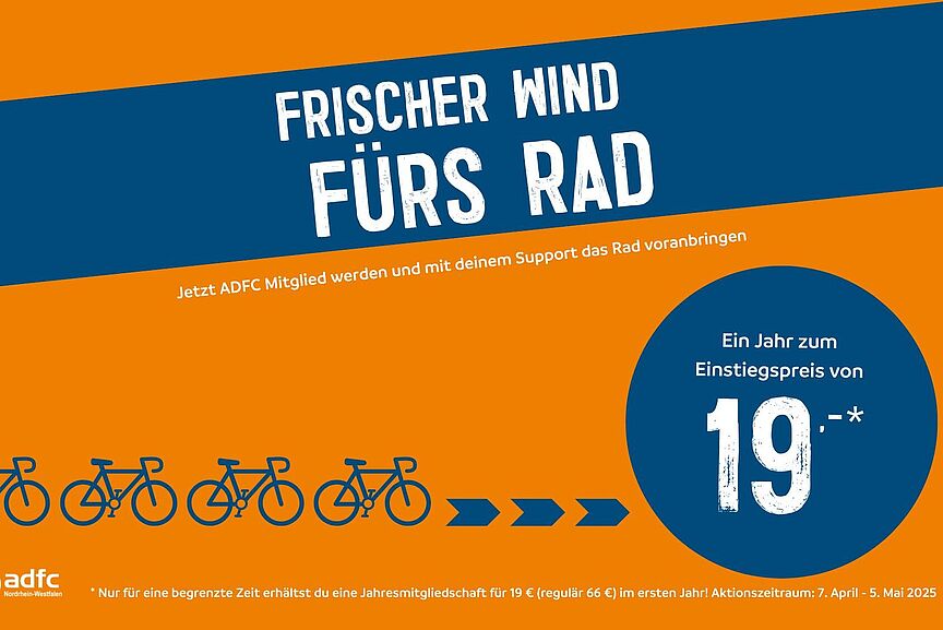 Du möchtest den ADFC bei seiner Arbeit unterstützen? Dann werde jetzt Mitglied zum Einstiegspreis von nur 19,- € (regulär 66,- €) für ein Jahr! Mit deinem Support können wir uns in der Politik für bessere Radwege stark machen.