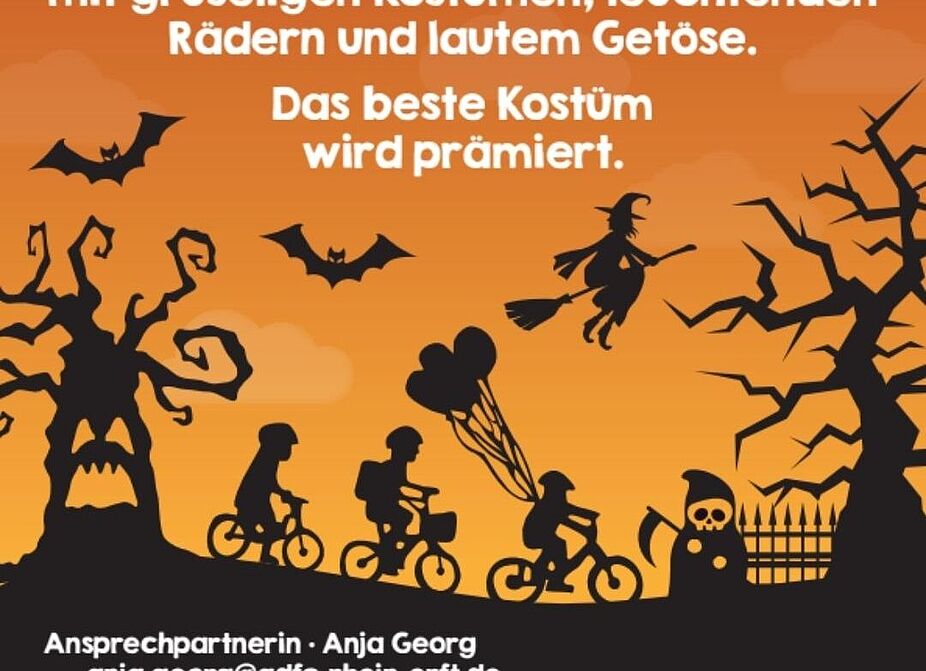 Wir radeln durch gruselige Straßen mit gruseligen Kostümen lechtenden Rädern und lautem Getöse.